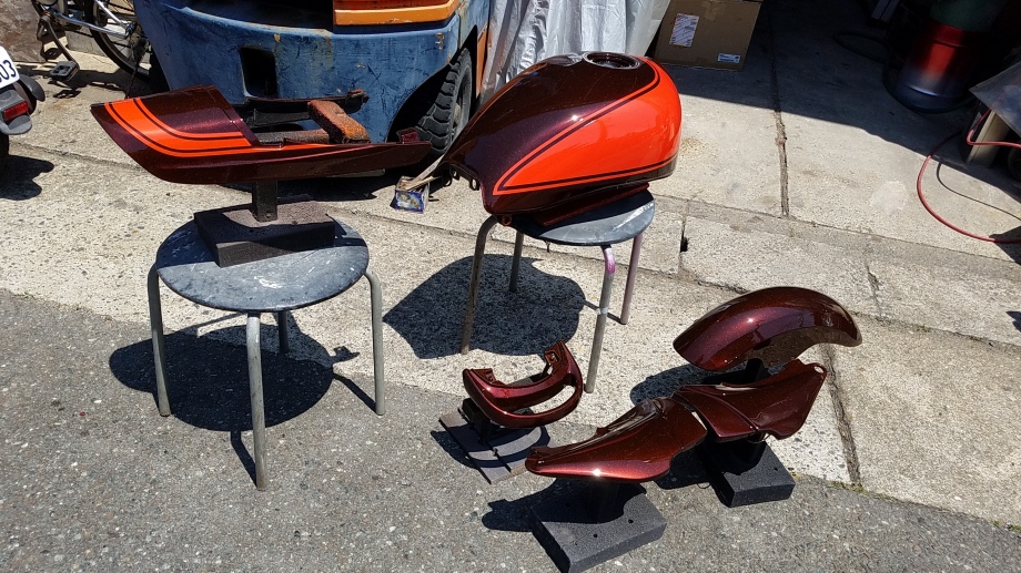 名古屋仕様のCBをよく見かけますが、この外装はフレークなど使ってないため、左右対称のマスキングは技術が要るものの割と塗装しやすいと思います。