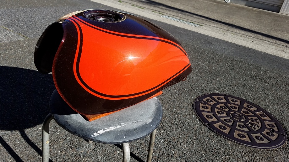 Z2の純正色できれいに塗装しました。ゼファー750の火タイガーカラーとは色もライン取りも全然違います。