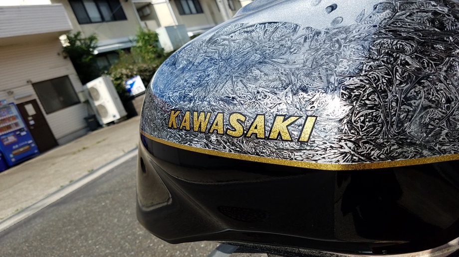 白のKAWASAKIもロゴで入れさせていただきました。タンクに映る建物を見れば、いかに鏡面かよくわかります。